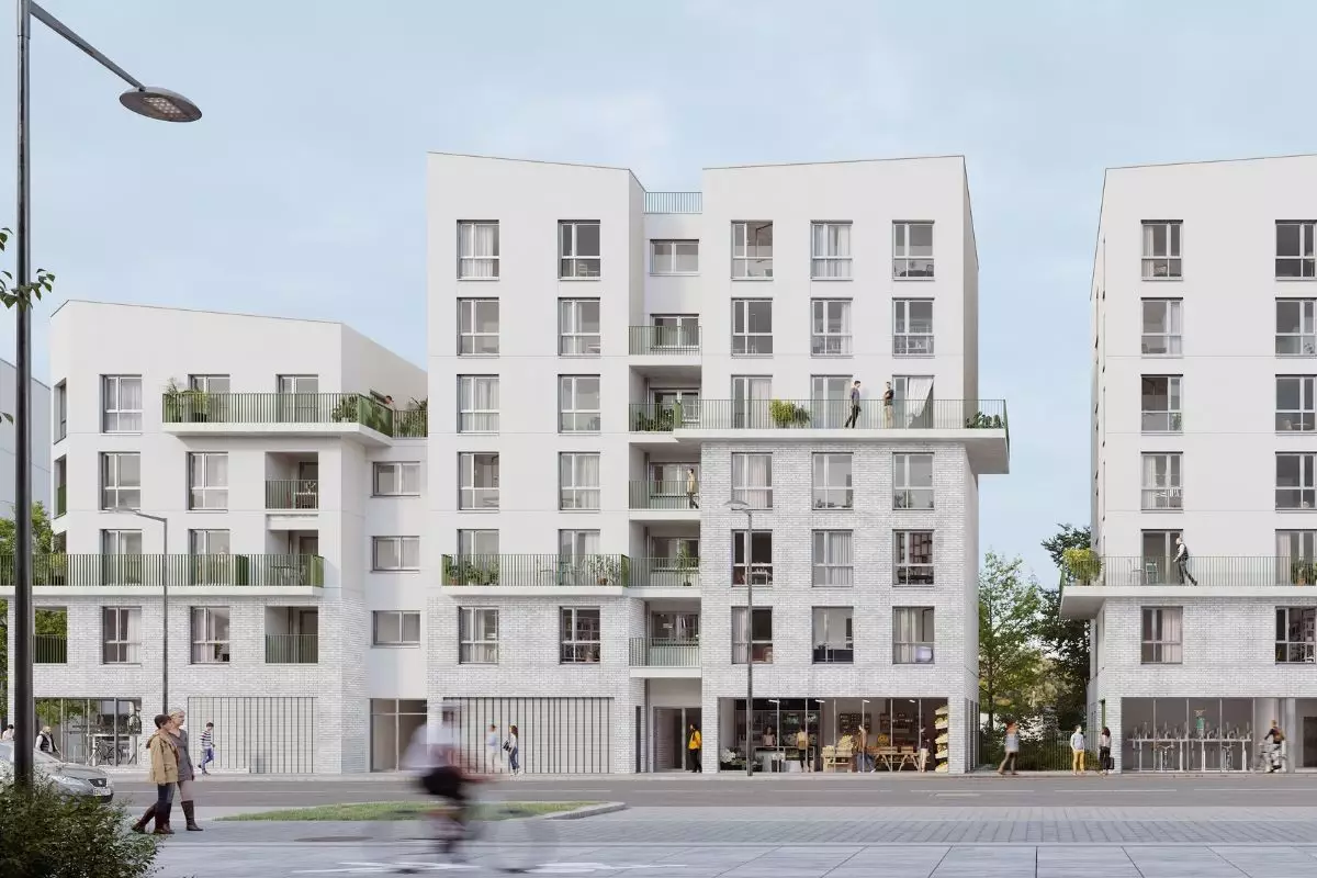 Chaque logement bénéficie d’un espace extérieur privatif — balcon, loggia ou terrasse selon l’étage — ainsi que de rangements intégrés (celliers et placards). Les circulations collectives sont desservies par un ascenseur et les stationnements sont organisés en sous-sol avec accès motorisé sécurisé ; un local vélos équipé complète les facilités pour les mobilités douces. La volumétrie en gradins et le choix de teintes claires associés à des détails vert Réséda confèrent à la façade une identité urbaine raffinée, en harmonie avec le tissu rennais.